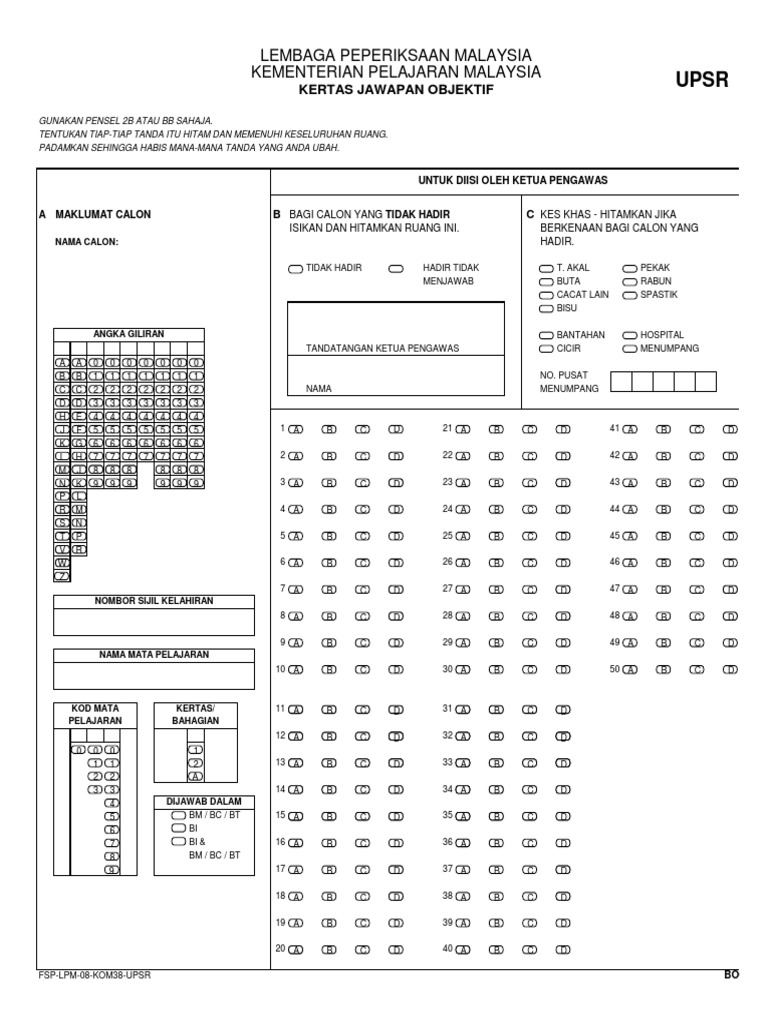 Kertas Jawapan Objektif Upsr : Klik pautan di bawah untuk memuat turun:. Soalan percubaan upsr 2012 negeri melaka soalan bahasa inggeris kertas 1. Soalan upsr 2017 bahasa inggeris dan skema jawapan. Berikut merupakan jawapan bagi kertas matematik kertas 2 ( upsr tahun 2017 ) ramai yang menyatakan bahawa soalan ini susah. Kurang arif tentang subjek lain, namun bagi subjek bahasa melayu, soalan objektifnya berjumlah 20 soalan, lebih sedikit bilangan, berbanding format sebelumnya. Kertas jawapan objektif (omr) upsr.